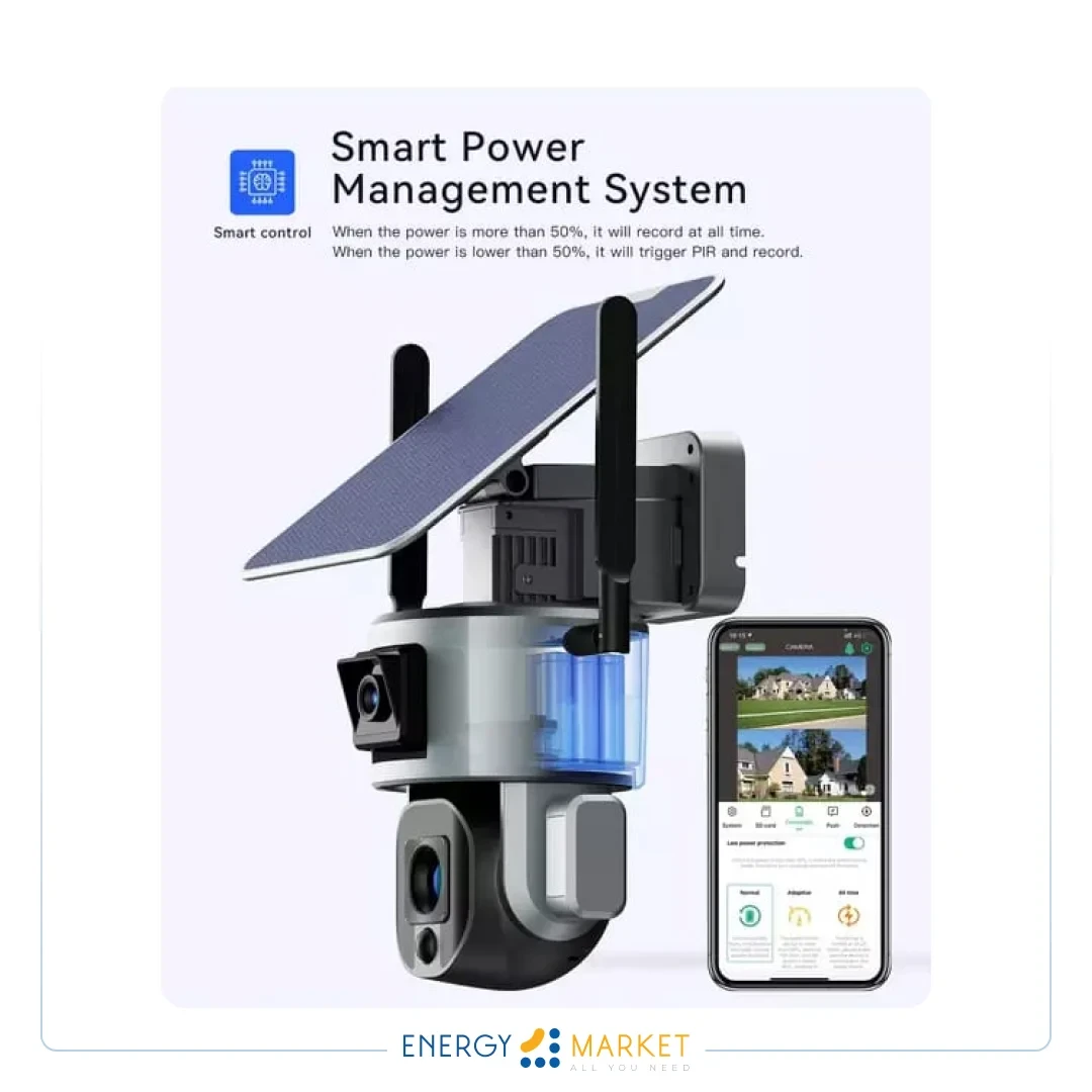 L'alimentation solaire de la caméra est basée sur un panneau solaire de 6W et une batterie de 20000mAh (21700-5000mAh x 4), ceci génère une autonomie la nuit et durant 2 à 3 jours sans luminosité.