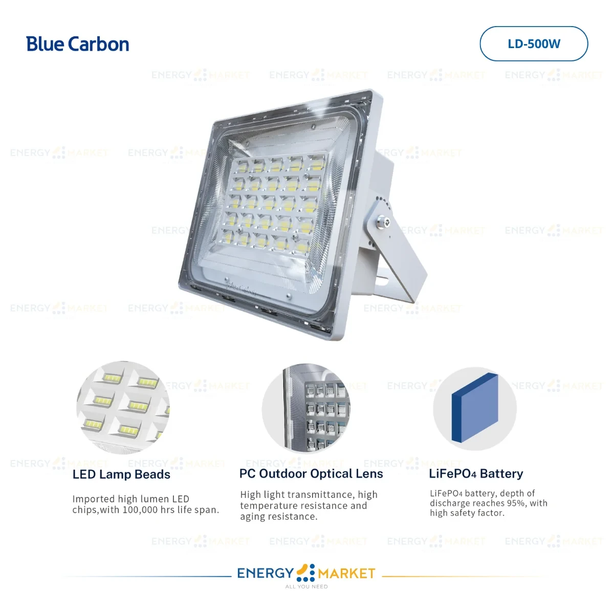 Le projecteur solaire Blue Carbon 500W incarne l’excellence en matière d’éclairage extérieur. Conçu pour offrir une puissance maximale, une autonomie totale et une durabilité exceptionnelle, il s’impose comme la solution idéale pour les grandes surfaces nécessitant un éclairage fiable et performant.